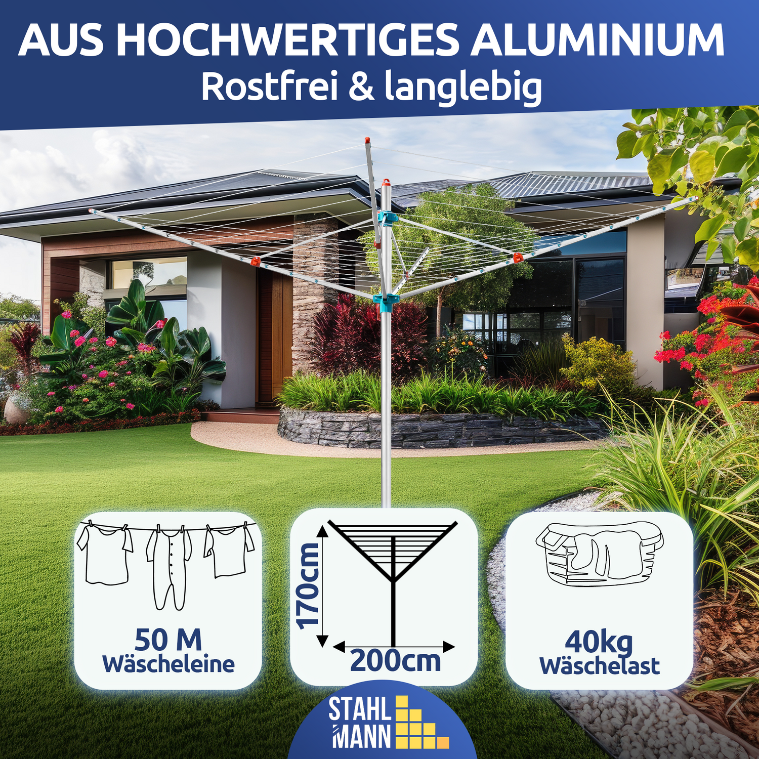 STAHLMANN® Wäschespinne – langlebige Qualität aus Aluminium mit 50 m Leinenlänge für große Wäscheladungen